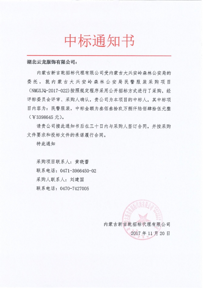 內蒙古大興安嶺森林公安局民警服裝采購項目